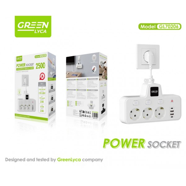 Regleta con 3 puertos+2 USB+ 2 Type-C, 2500W, 7en 1, 110-250V